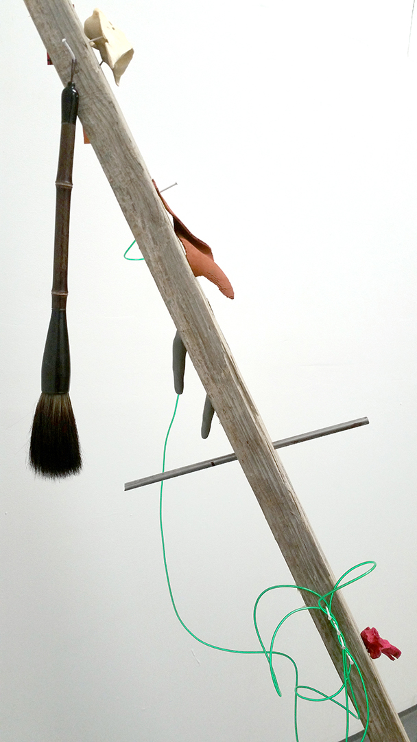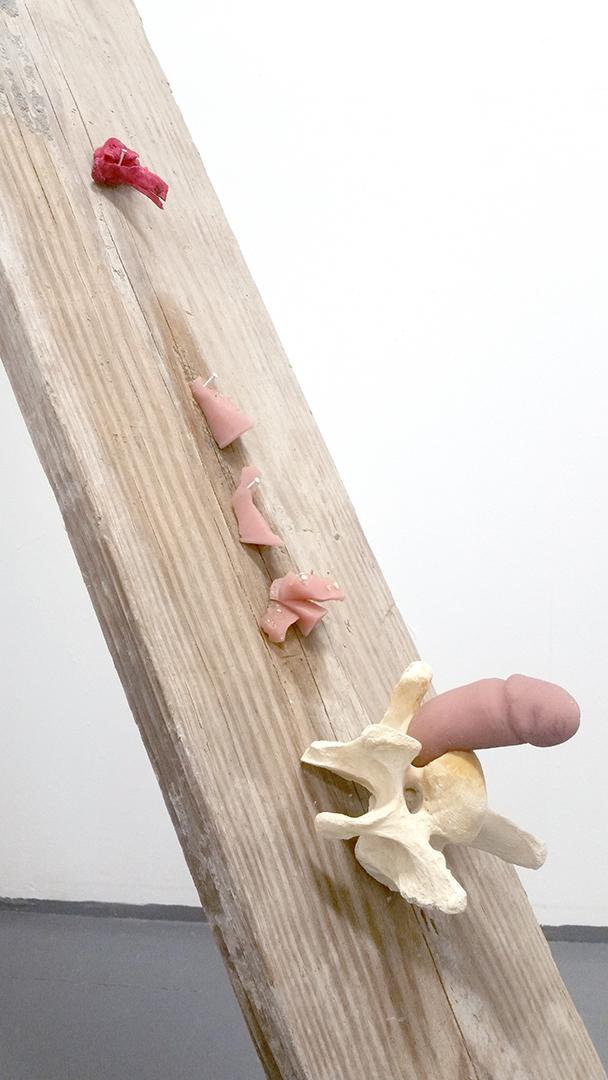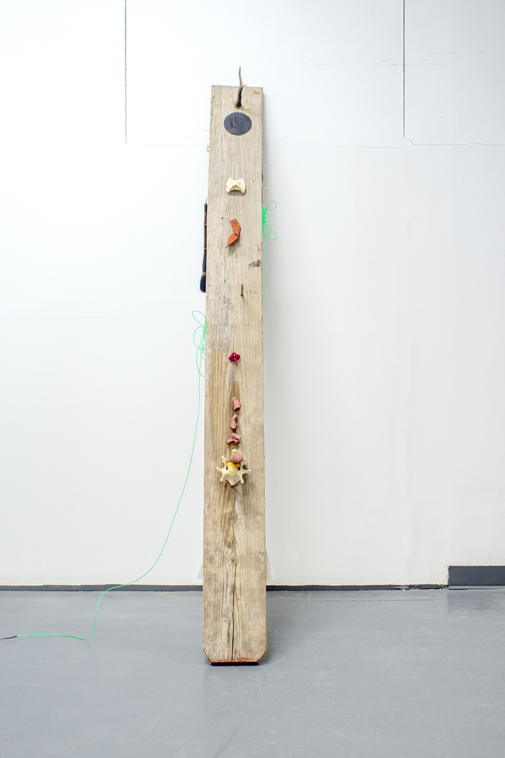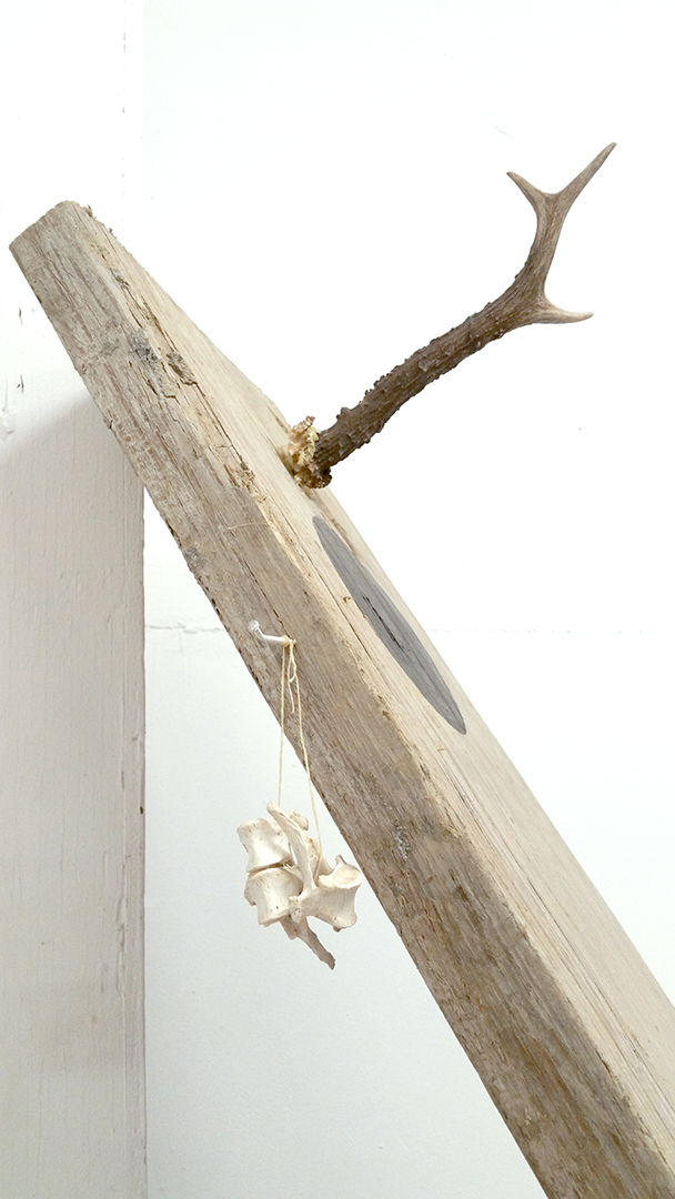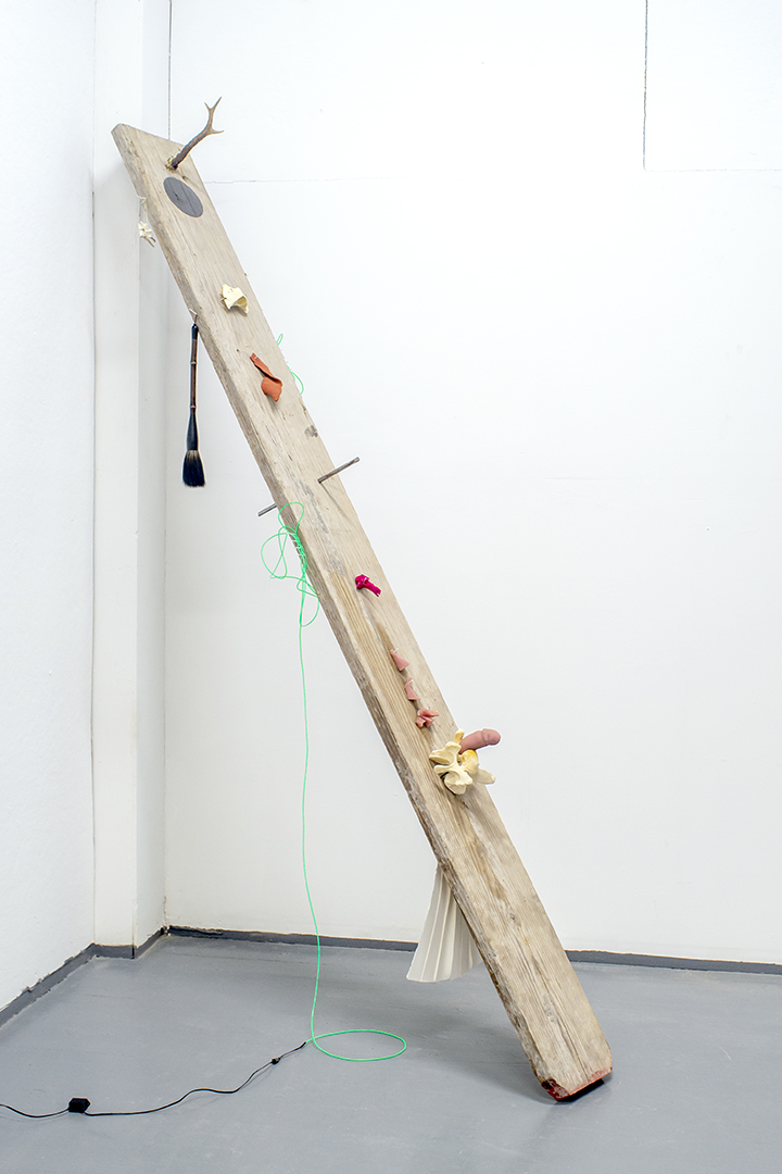 Leaning Plank 1 Wood, bone, resin, steel, paper, acrylic, rubber, LED wire, silicone, antler. 2019